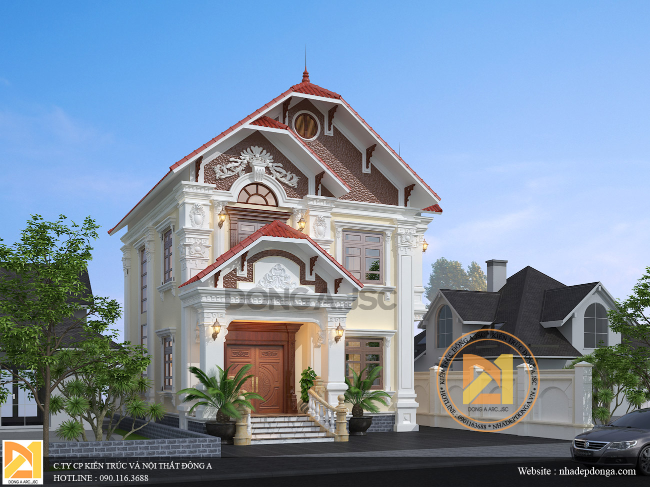 Bố cục biệt thự thiết kế chặt chẽ, đăng đối. Sảnh biệt thự được thiết kế ấn tượng với những chi tiết hoa văn trang trí tỉ mỉ ở mái hiên sảnh, cùng hệ mái thái đỏ tươi độ cao hợp lý giúp tránh khí nóng từ mái vào nhà. Phần nền móng biệt thự được đôn cao 5 bậc giúp tránh khí nóng từ mặt đất xông lên nhà vào mùa nóng.