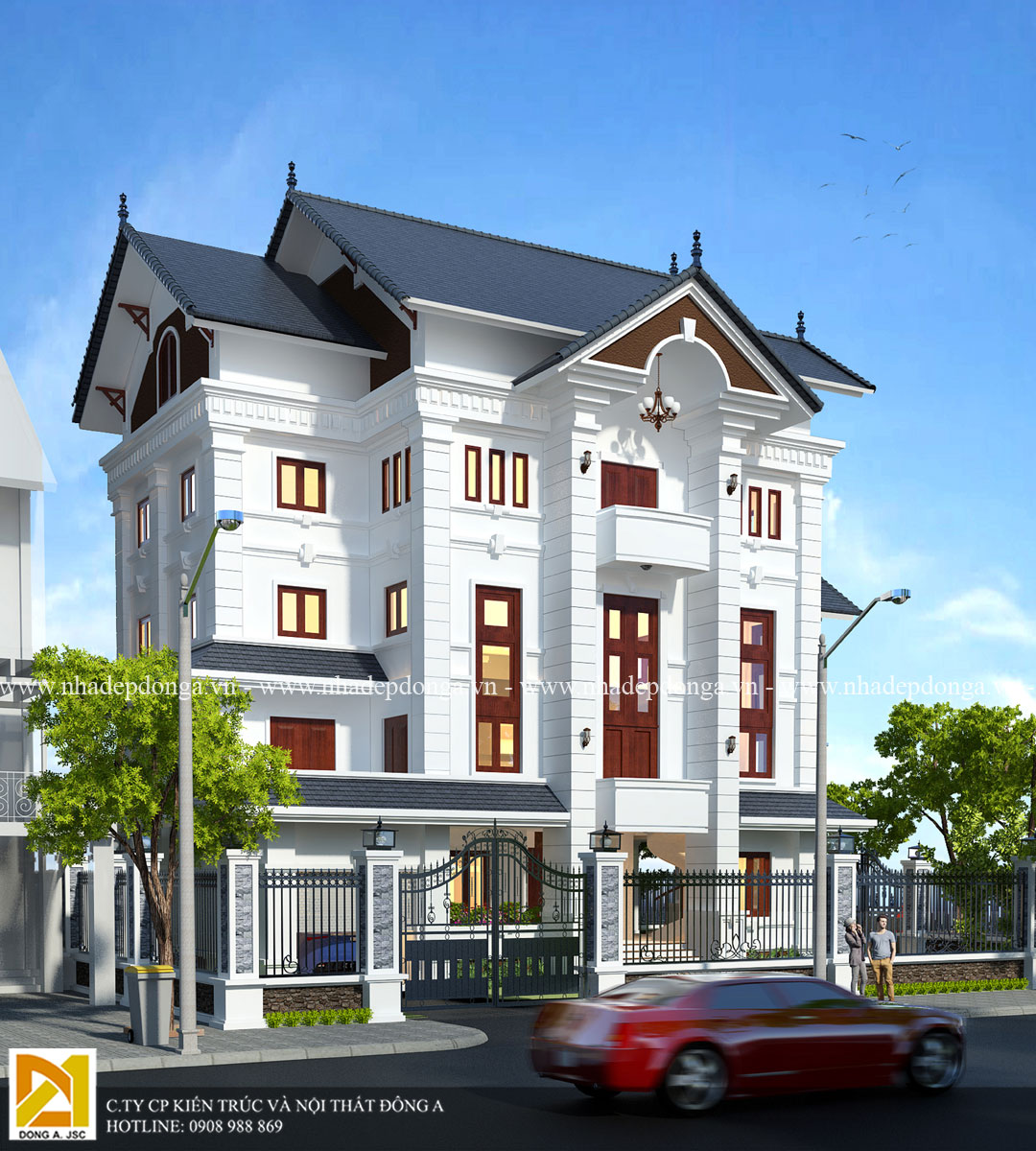 Ở thế đất khá đặc biệt, nằm cạnh nơi giao nhau giữa hai con đường, biệt thự 4 tầng của gia đình anh Kiên là một trong những mẫu kiến trúc thiết kế tân cổ điển tuyệt đẹp với 2 mặt tiền mà Kiến trúc Đông A đã đảm nhận.