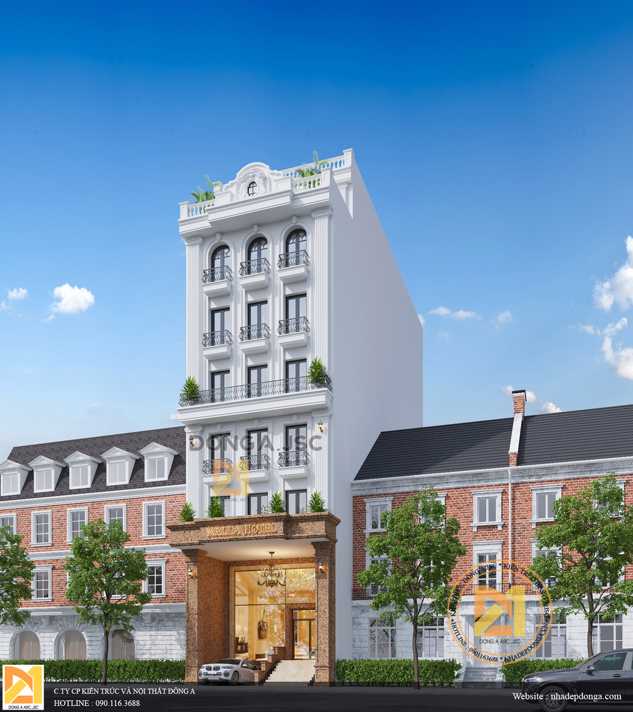 Dưới đây KTS Đông A gửi tới quý độc giả mẫu thiết kế khách sạn đẹp mang phong cách tân cổ điển hào hoa.